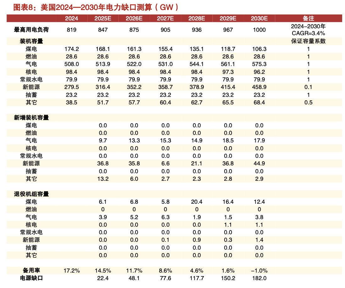 缺口量化:若考虑数据中心增长超预期,2025-2030年美国可能产生201GW的电力总缺口。为解决缺口,美国势必从“扩大电源装机(燃气、核电、SOFC)”和“电网/用户侧升级(储能、变压器、SST)”两端发力。
