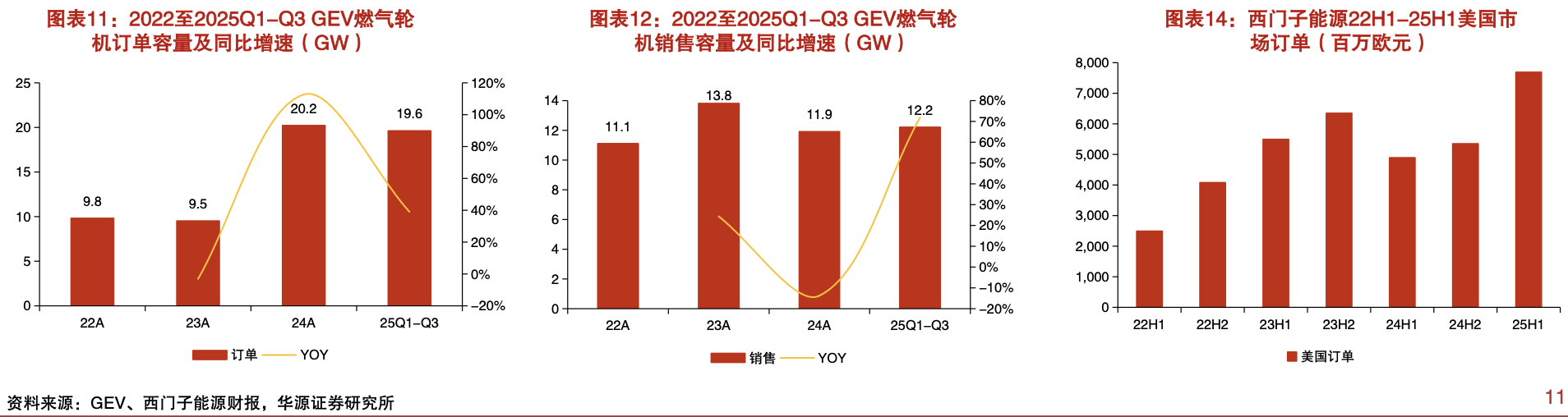 ①短期高景气:天然气发电对环境友好且灵活,是填补缺口的重要方式。海外巨头GEVernova和西门子能源的燃机订单持续高增,GEV电力板块在手订单创近5年新高。
