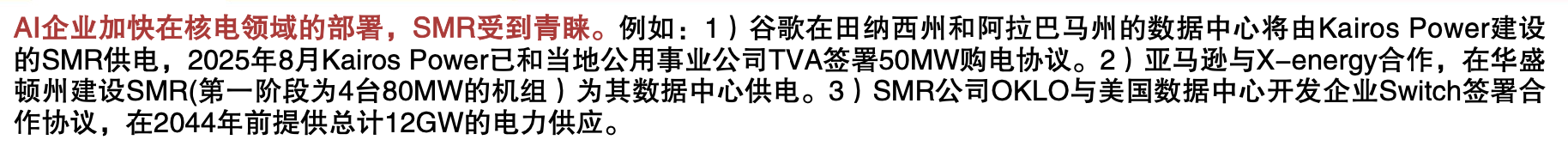 ①巨头押注:AI数据中心需要稳定的基荷电源。谷歌、亚马逊、微软等纷纷与核电公司签署供电协议或投资SMR(小型模块化反应堆)。