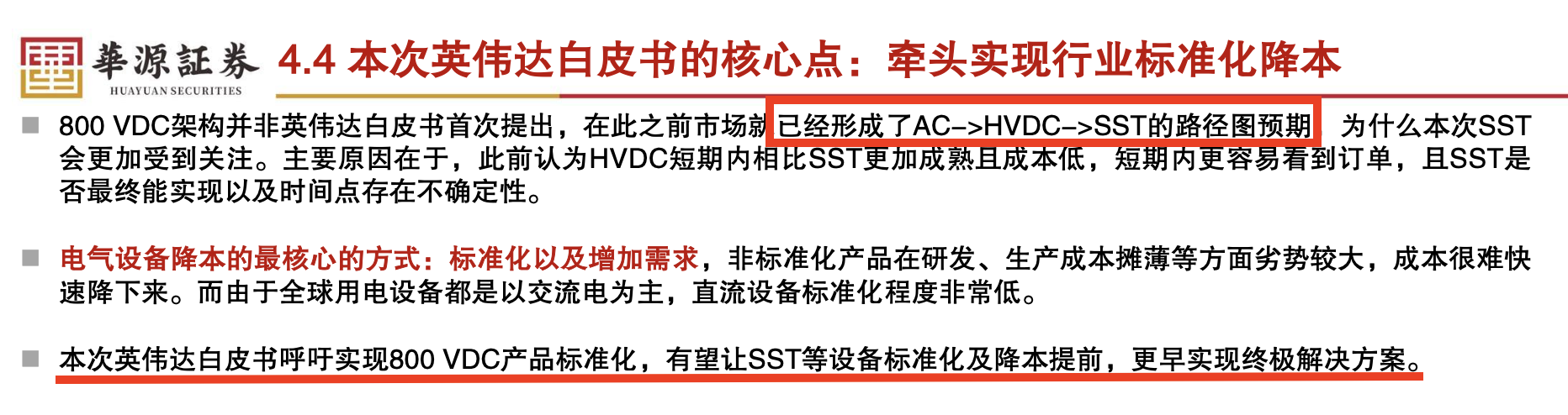 ②技术变革(SST):为提高效率,数据中心供电架构向高压直流演进。英伟达、谷歌等明确提及固态变压器(SST)技术,相比传统方案效率更高,有望成为未来的主流技术路线。