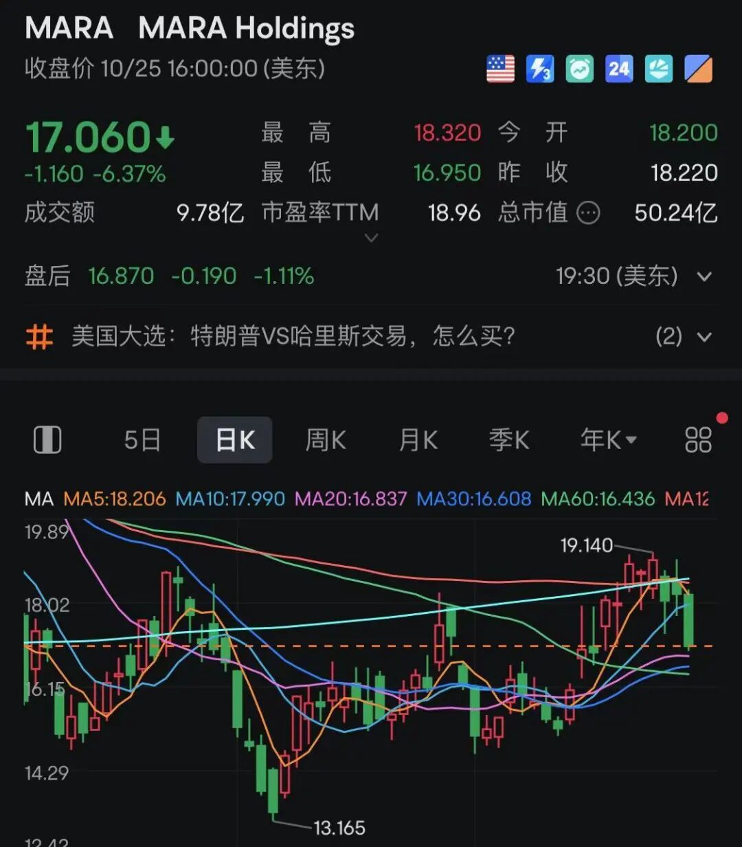 美股方面,与加密货币相关的股票也集体大跌,MARA Holdings股价一度下跌7%,Riot Platforms跌超5%。