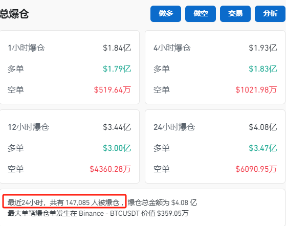 比特币一度大跌,根据Coinglass数据显示,虚拟货币集体大跌,其中,比特币一度跌近4%,截至发稿仍跌超2%,以太坊跌超4.7%,过去24小时内,虚拟货币共有超14.7万人爆仓。
