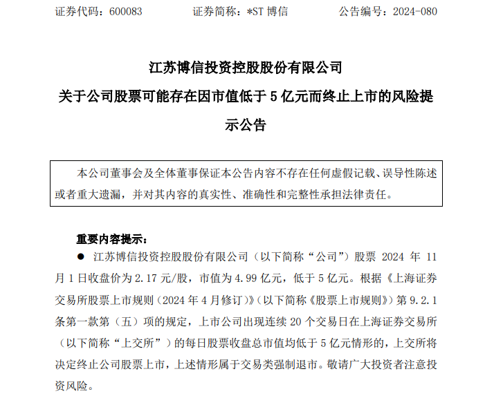 *ST博信(600083)11月1日晚间披露,公司股票当日收盘价为2.17元/股,市值为4.99亿元,低于5亿元,公司股票存在可能因市值低于5亿元被终止上市的风险。