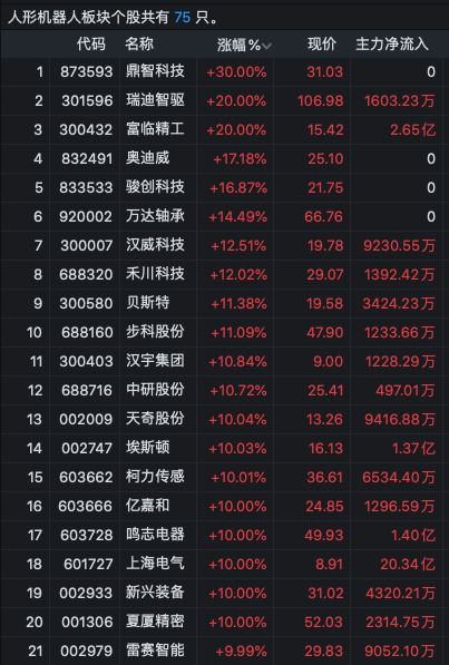 鼎智科技高开后直线拉升,仅约10分钟左右就30%涨停,雷赛智能、埃斯顿、柯力传感等逾20股涨停或涨超10%。
