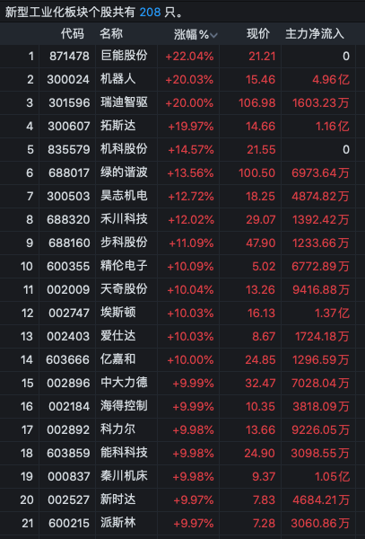 新型工业化概念股早间集体上攻,板块指数盘中放量大涨逾4%。瑞迪智驱连续第2日20%涨停,拓斯达亦强势20cm封板,绿的谐波、中大力德、新时达、派斯林等逾20股涨停或涨超10%。