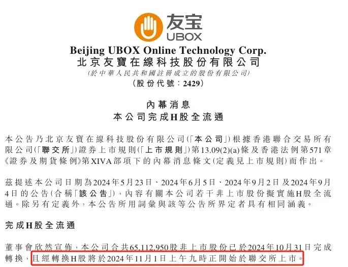 友宝在线此前公布了H股全流通信息。该股去年11月3日上市,如今是上市一周年届满。公司此前发布公告显示,该公司单一最大股东组别王滨、陈昆嵘及包括奈雪的茶、马六甲在内的基石投资者的受禁售承诺规限股份的截止日期为11月3日。据活报告此前统计,友宝在线此次解禁股数超2亿股,占总股本27.88%。