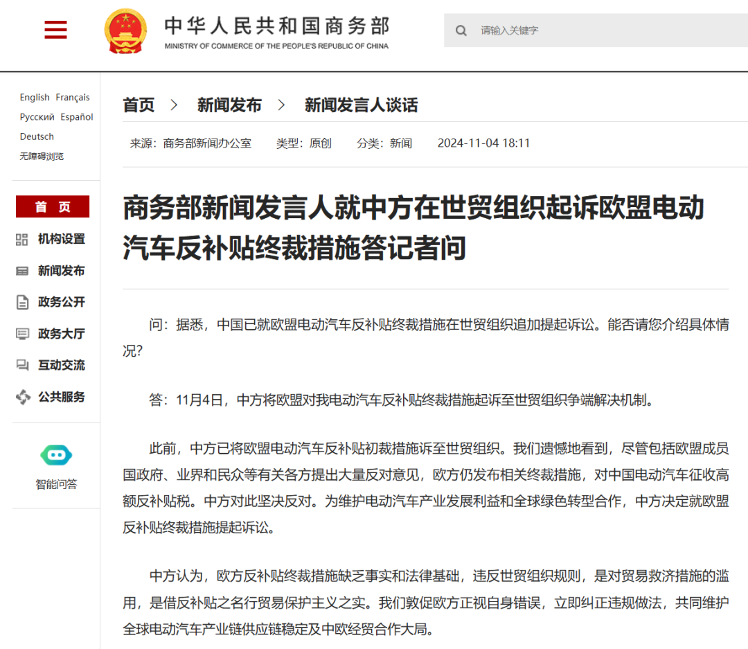答:11月4日,中方将欧盟对我电动汽车反补贴终裁措施起诉至世贸组织争端解决机制。