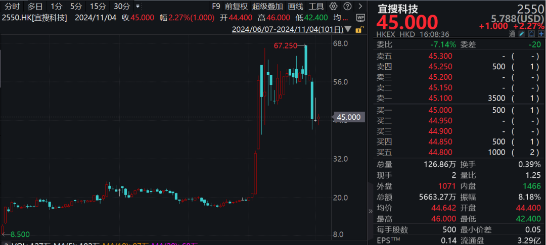 招股书显示,2021年,宜搜小说APP月活1800万人,为阅文集团、掌阅科技、咪咕数媒、阿里文学之后国内第五大网文阅读平台。2024年上半年,宜搜科技总营收同比增长13.37%,达到约2.78亿元;毛利润约1.15亿元,毛利率为41.31%;期内经调整盈利金额为1772.2万元,相较去年同期亏损292.4万元人民币而言,成功扭亏为盈。此前9月公司获纳入港股通,流通性的提升或在一定程度上也助力了公司股价上涨。