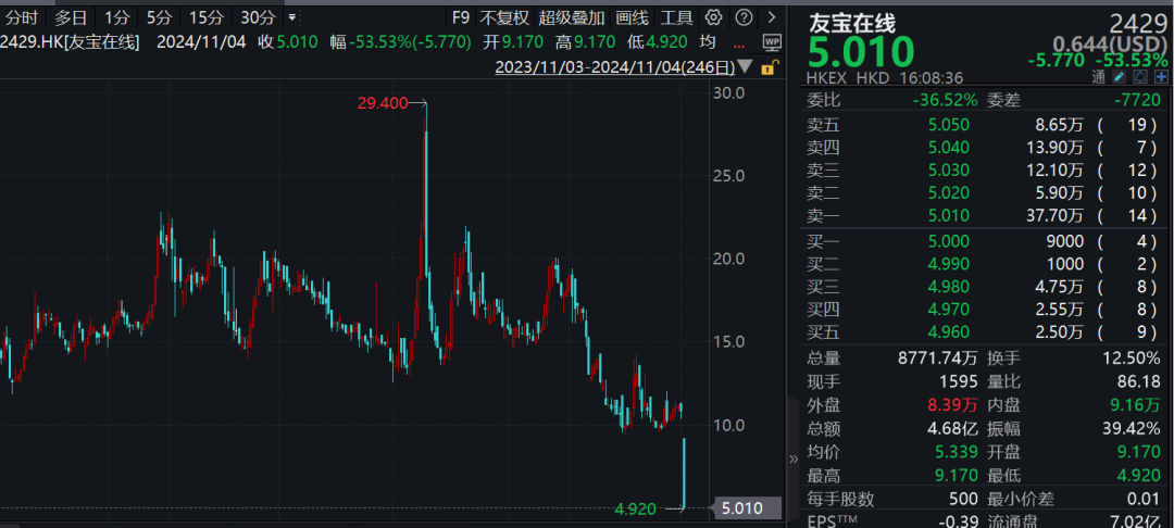 以2023年11月3日上市的友宝在线为例,其上市刚满一周年,今天即暴跌53.53%。友宝在线是国内自动售卖机行业的龙头企业,其股价”跳水“或与其迎来大规模股票解禁有关。