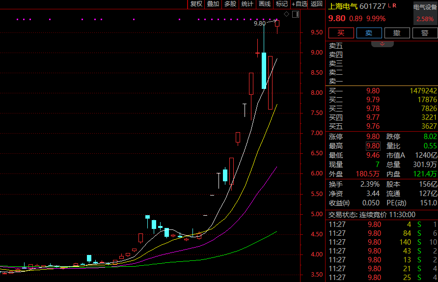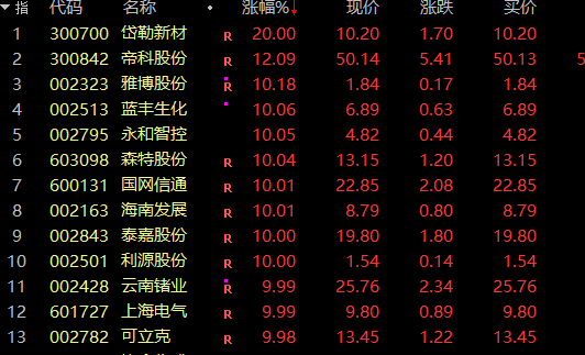 岱勒新材垂直20%涨停,创近10个月新高;上海电气高开后秒涨停,近12个交易日9涨停;帝科股份、协鑫集成等逾10股亦涨停或涨超10%。