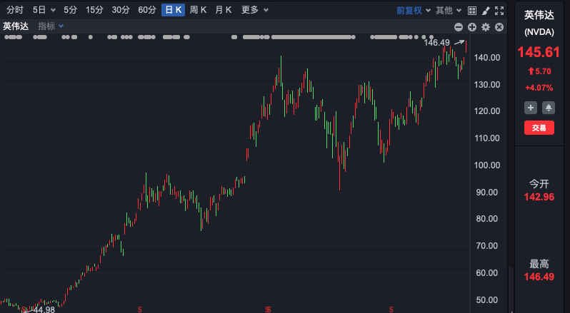 英特尔涨超7%,英伟达、谷歌涨约4%,亚马逊涨超3%,奈飞、微软涨超2%。其中,英伟达、亚马逊、奈飞均再创收盘新高。