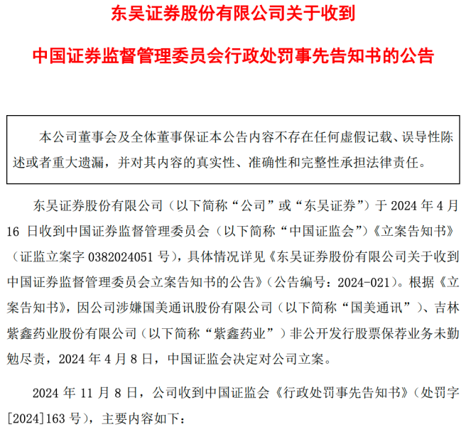 11月8日晚间,东吴证券公告称收到来自监管的《行政处罚事先告知书》。中国证监会已对相关案情调查完毕,拟对该公司涉嫌国美通讯、紫鑫药业的非公开发行股票保荐业务未勤勉尽责,依法作出行政处罚。