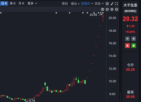 个股方面,大千生态盘中涨停走出8连板后开板,最新涨幅为8.26%。