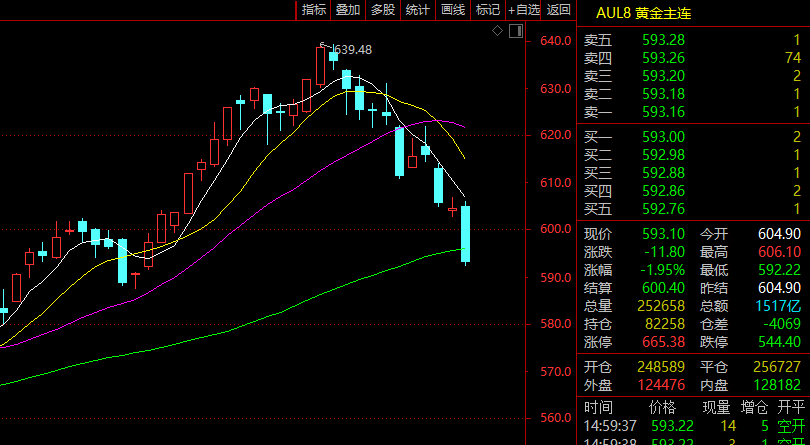 甚至黄金期货主力合约盘中也一度跌逾2%,收盘微幅上翘,报收于593.1元,跌1.95%,距离10月底的历史最高点合计跌去逾7.25%。