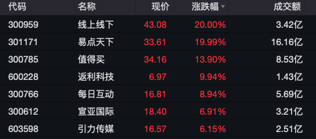 消费股拉升。拼多多概念股猛拉,线上线下、易点天下涨停,值得买涨超10%,每日互动、宣亚国际等跟涨。