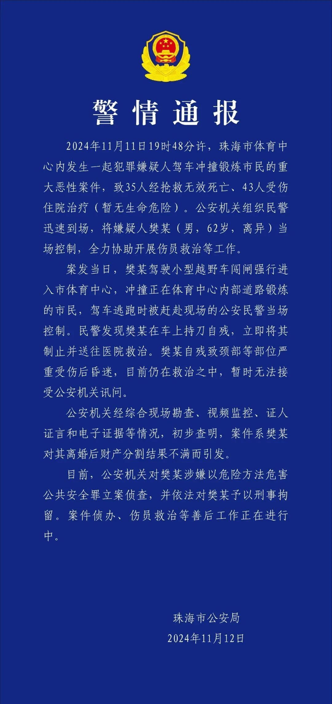 2024年11月11日19时48分许,珠海发生一起驾车冲撞市民重大恶性案件。12日,珠海市公安局发布警情通报,案件致35人死亡,43人受伤。详情如下: