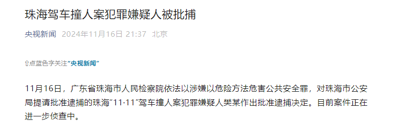 2024年11月16日,广东省珠海市人民检察院依法以涉嫌以危险方法危害公共安全罪,对珠海市公安局提请批准逮捕的珠海“11·11”驾车撞人案犯罪嫌疑人樊某作出批准逮捕决定。目前案件正在进一步侦查中。