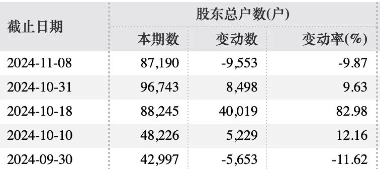从股东户数来看,银邦股份的筹码集中度变化极大。数据显示,9月30日至10月31日,公司股东户数从42997户大幅放量至96743户,增幅超120%;截至11月8日,股东户数又缩减至87190户,8个交易日内减少了9553户,降幅近10%。
