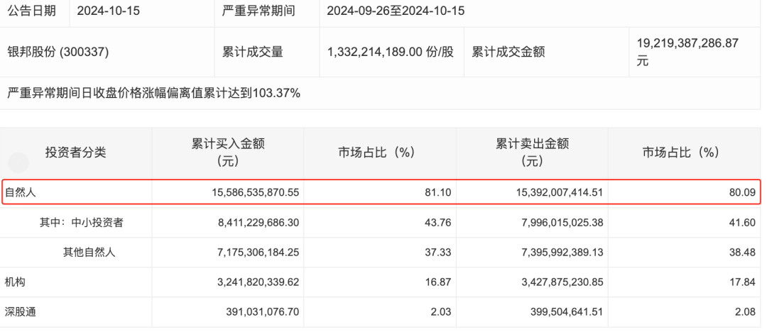 9月26日至10月15日期间,即公司股价上涨最快的时间段内,自然人买入及卖出金额分别为155.87亿元、153.92亿元,占比分别达81.1%、80.09%。其中中小投资者买入金额为84.11亿元,占总买入金额的43.76%;卖出金额约80亿元,占卖出总额的41.6%。