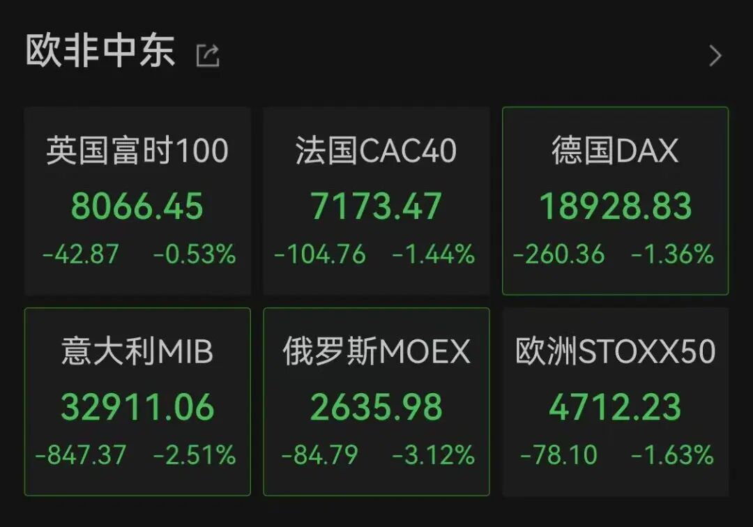 欧洲股市也纷纷下跌,英法德三国重重要股指集体飘绿。