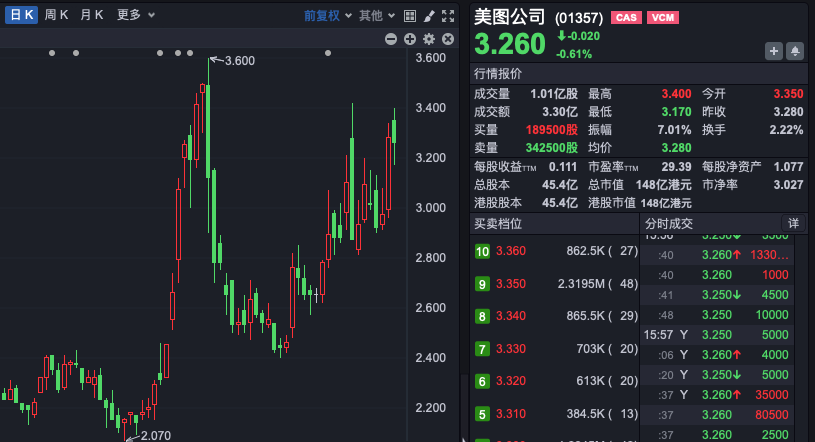 美图公司2016年上市,2017年达到历史高点23港元/股。该股最新收盘价为3.26港元,市值148亿港元。