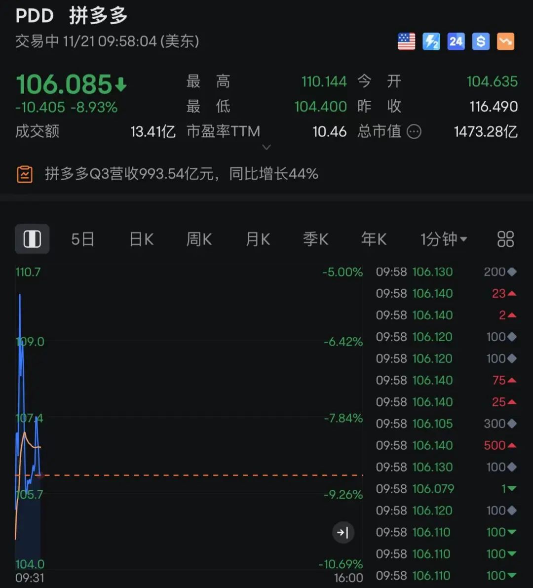 热门中概股中,拼多多三季报不及预期,盘中一度跌超10%。