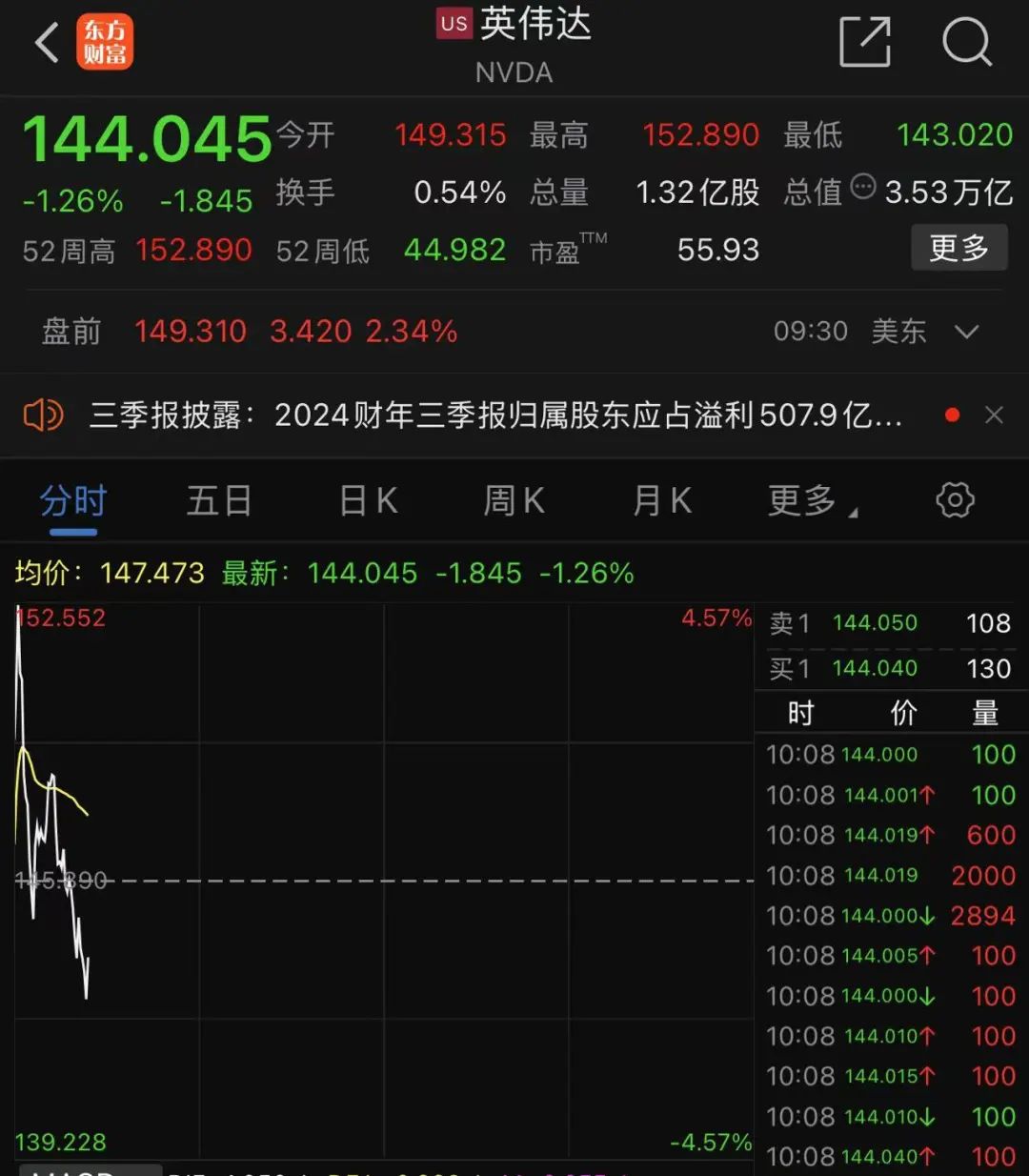 芯片股领涨。英伟达盘中股价一度大涨近5%,再创历史新高,最高报152.89美元/股,对应总市值近3.7万亿美元。不过随着美股集体跳水,英伟达也转跌。
