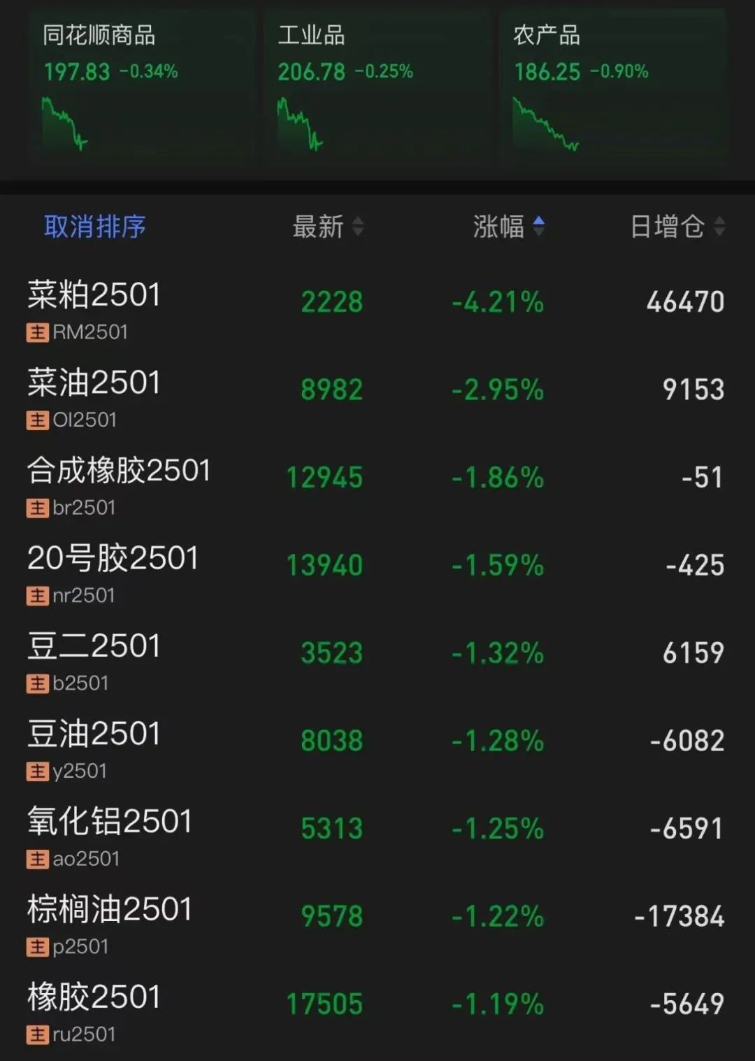 国内期货夜盘收盘跌多涨少。菜粕跌超4%,菜油跌近35,菜籽油跌逾2%,豆二、棕榈油、橡胶等跌超1%。