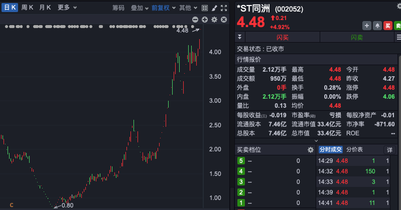 截至11月21日收盘,*ST同洲最新股价为4.48元/股,总市值33.42亿元。