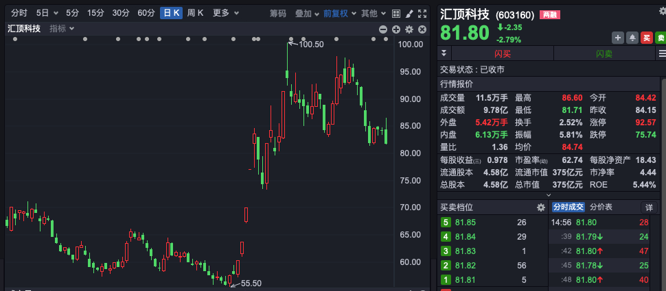 双方签订意向协议当日,11月22日汇顶科技股价收跌2.79%,报收81.8元/股,总市值375亿元。