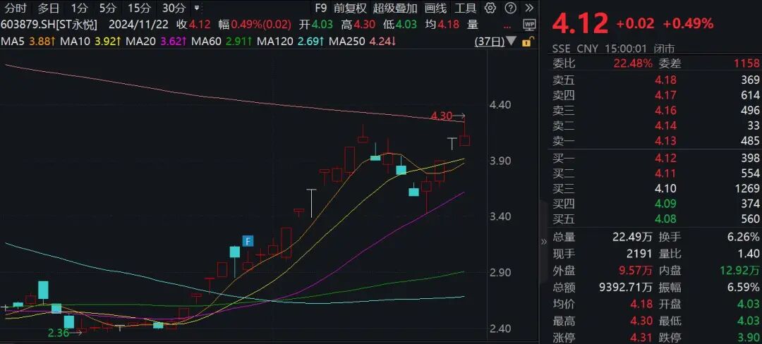 从二级市场看,近段时间,ST永悦股价涨幅明显。近4个交易日累计涨幅超过15%,若把时间拉长,10月23日至今,涨幅超过67%,最新报收4.12元/股,总市值为15亿元。