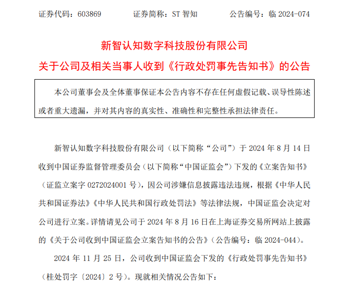 ST智知11月26日晚披露,公司收到证监会下发的《行政处罚事先告知书》(《告知书》)。因公司2019年至2021年的年报均存在虚假记载等违法行为,证监会拟对公司予以处罚。