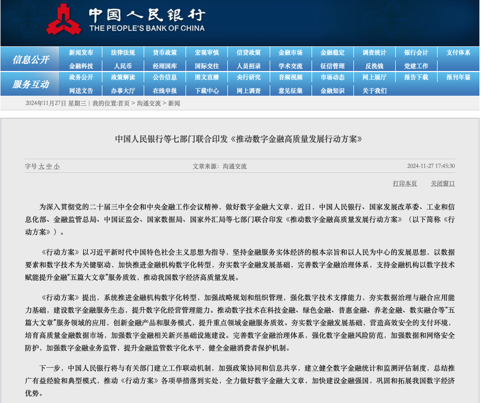 据中国人民银行消息,为深入贯彻党的二十届三中全会和中央金融工作会议精神,做好数字金融大文章,近日,中国人民银行、国家发展改革委、工业和信息化部、金融监管总局、中国证监会、国家数据局、国家外汇局等七部门联合印发《推动数字金融高质量发展行动方案》(以下简称《行动方案》)。