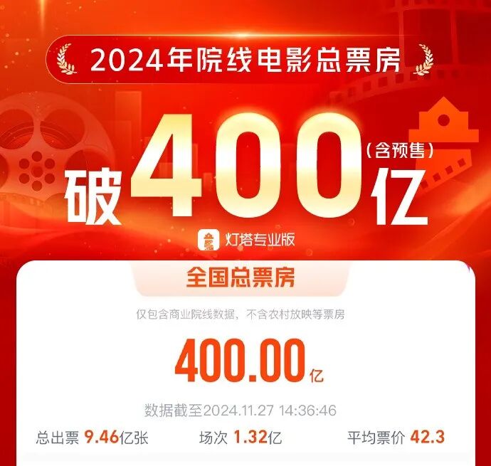 11月27日,根据灯塔专业版数据,截至11月27日,2024年度中国电影总票房(含预售)已突破400亿元,总出票9.46亿张,场次1.32亿,平均票价42.3元。其中,《热辣滚烫》《飞驰人生2》《抓娃娃》暂列年度票房前三名。
