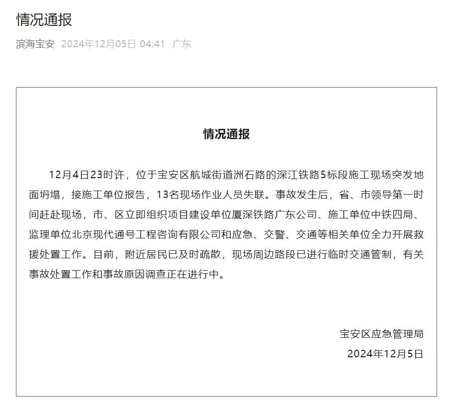 12月4日23时许,位于宝安区航城街道洲石路的深江铁路5标段施工现场突发地面坍塌,接施工单位报告,13名现场作业人员失联。事故发生后,省、市领导第一时间赶赴现场,市、区立即组织项目建设单位厦深铁路广东公司、施工单位中铁四局、监理单位北京现代通号工程咨询有限公司和应急、交警、交通等相关单位全力开展救援处置工作。目前,附近居民已及时疏散,现场周边路段已进行临时交通管制,有关事故处置工作和事故原因调查正在进行中。