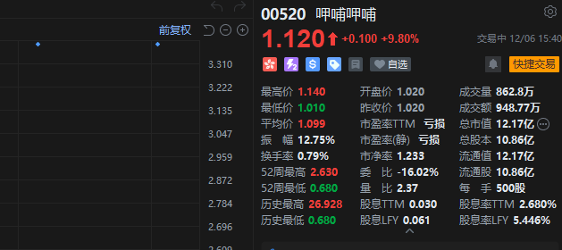 餐饮市场复苏势头也反映在二级市场上。12月6日,港股上市的餐饮股多数走高,截至当日中午收盘,呷哺呷哺大涨8.82%,报1.11港元;特海国际涨8.38%,报18.1港元;百胜中国涨4.11%,报379.8港元;海底捞涨3.76%,报16港元;九毛九涨3.88%,报3.48港元。