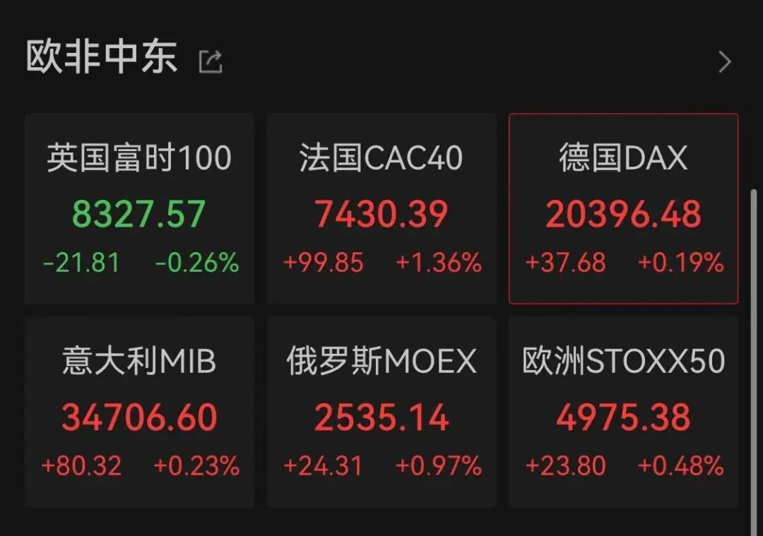 此外,欧洲市场在深夜涨跌不一,其中法国CAC40指数大涨超1%。
