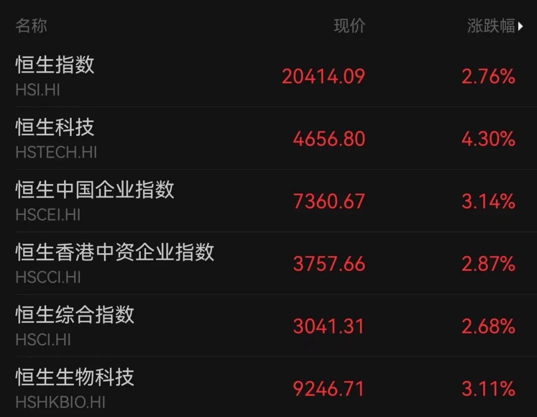 此外,港股也迎来大爆发。截至收盘,香港恒生指数涨2.76%,重新站上2万点;恒生科技指数涨超4.3%。