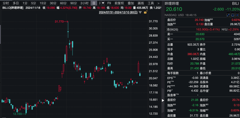 热门中概股普遍下跌。房多多大跌超26%,老虎证券跌逾14%,富途控股、哔哩哔哩跌逾11%,百济神州跌超9%,蔚来跌超7%,小鹏汽车跌超6%。