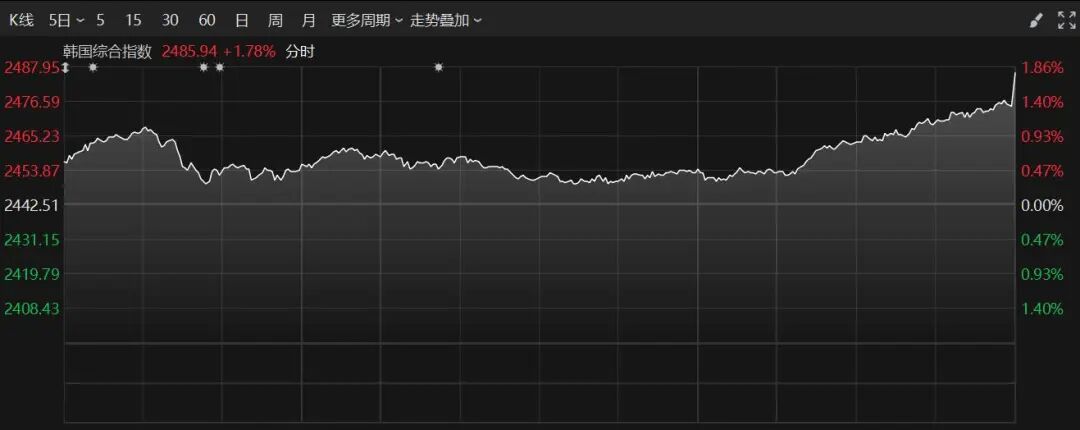 尾盘直线拉升!韩国股市大涨近1.8%