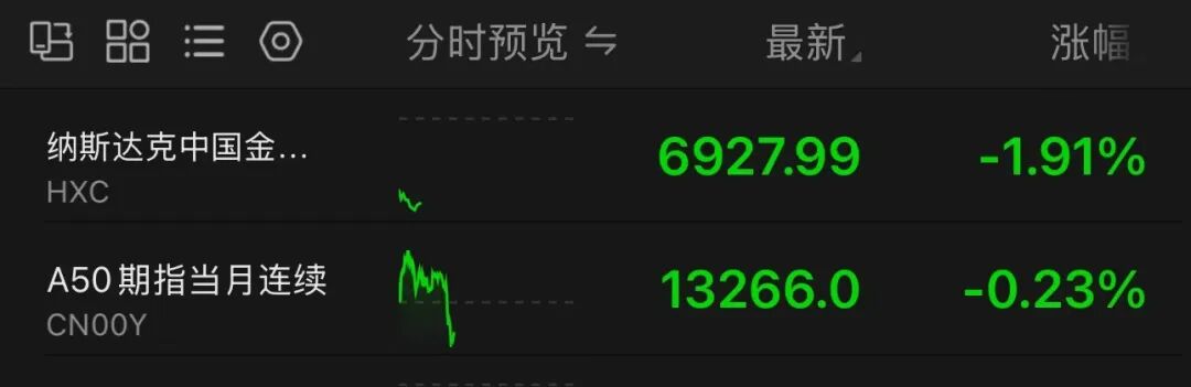 纳斯达克中国金龙指数盘中跌超2%。A50期货指数也直线下跌。