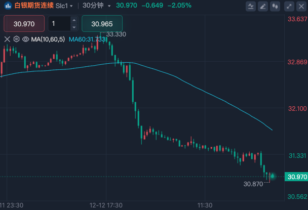 COMEX白银日内下跌超2%,现报30.97美元/盎司,两天内自高点以来已跌超7%。