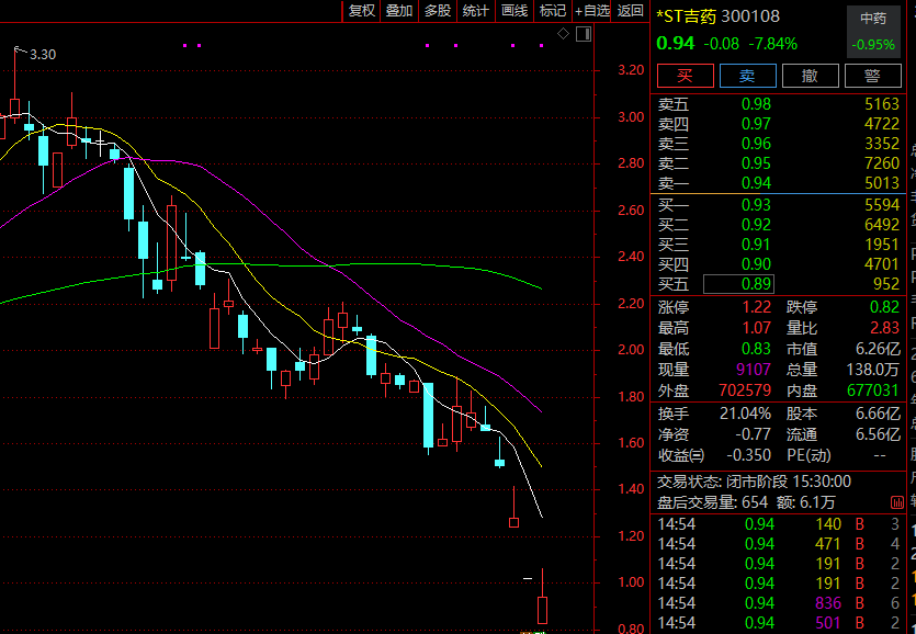 1月3日,*ST吉药以0.83元开盘,距跌停价格仅差0.01元。之后,*ST吉药快速反弹,盘中最高涨至1.07元,股价全天大部分时间都是在1元面值下方运行。截至1月3日收盘时止,*ST吉药报于0.94元,下跌0.08元,跌幅为7.84%。
