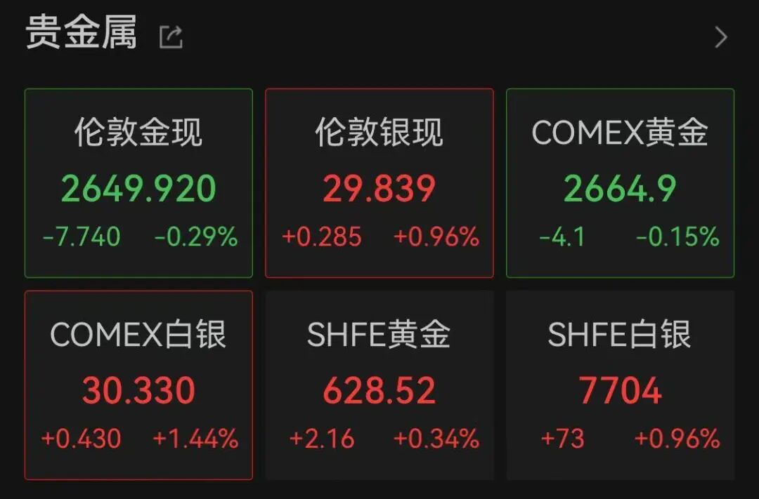 黄金、白银则涨跌不一,黄金在今日出现回调,白银继续强势拉涨。