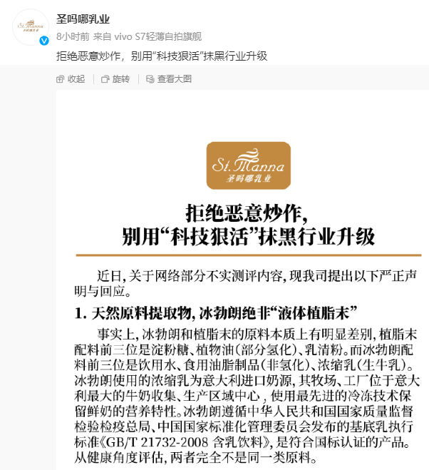 圣吗哪回应,根据国际检测机构SGS的数据,就原料本质与健康影响而言,冰勃朗与植脂末是两种完全不同的食品原料,评测视频以偏概全,采用错误的实验数据,而非实际使用场景来对饮品的工艺定性。尽管该测评博主已经删除了视频,但视频的传播已经事实上对企业商誉造成了伤害,也误导了消费者。