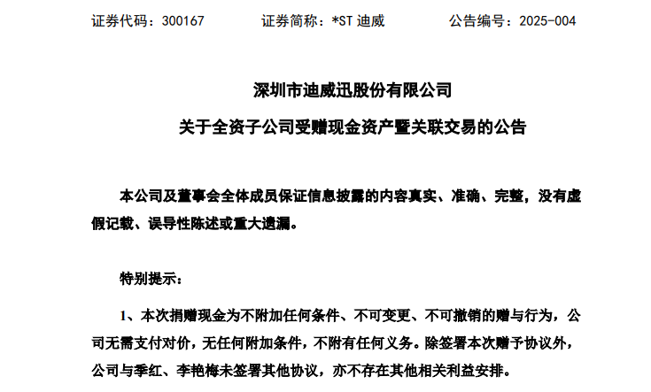 *ST迪威于2024年12月30日召开了第五届董事会第三十七次(临时)会议,审议通过了《关于全资子公司受赠现金资产暨关联交易的议案》。当时,鉴于全资子公司迪威数据目前的经营状况,季红和李艳梅就明确分别向迪威数据无偿赠与现金资产2000万元、100万元。