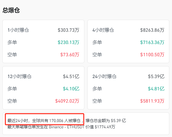 此外,之前重回10万美元的比特币也出现暴跌走势,过去24小时内跌超5%,跌破97000美元,除比特币之外,其余虚拟货币也全线暴跌,Coinglass数据显示,过去24小时内,虚拟货币共有近17万人爆仓。
