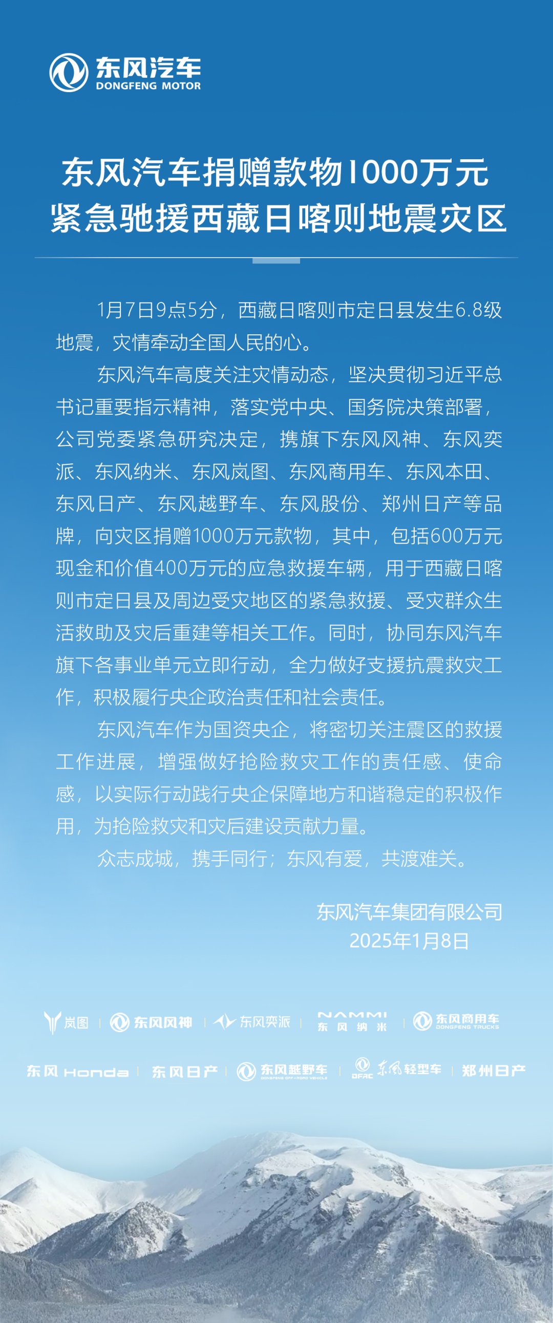 1月8日晚间,东风汽车宣布,捐赠款物1000万元,紧急驰援西藏日喀则地震灾区。
