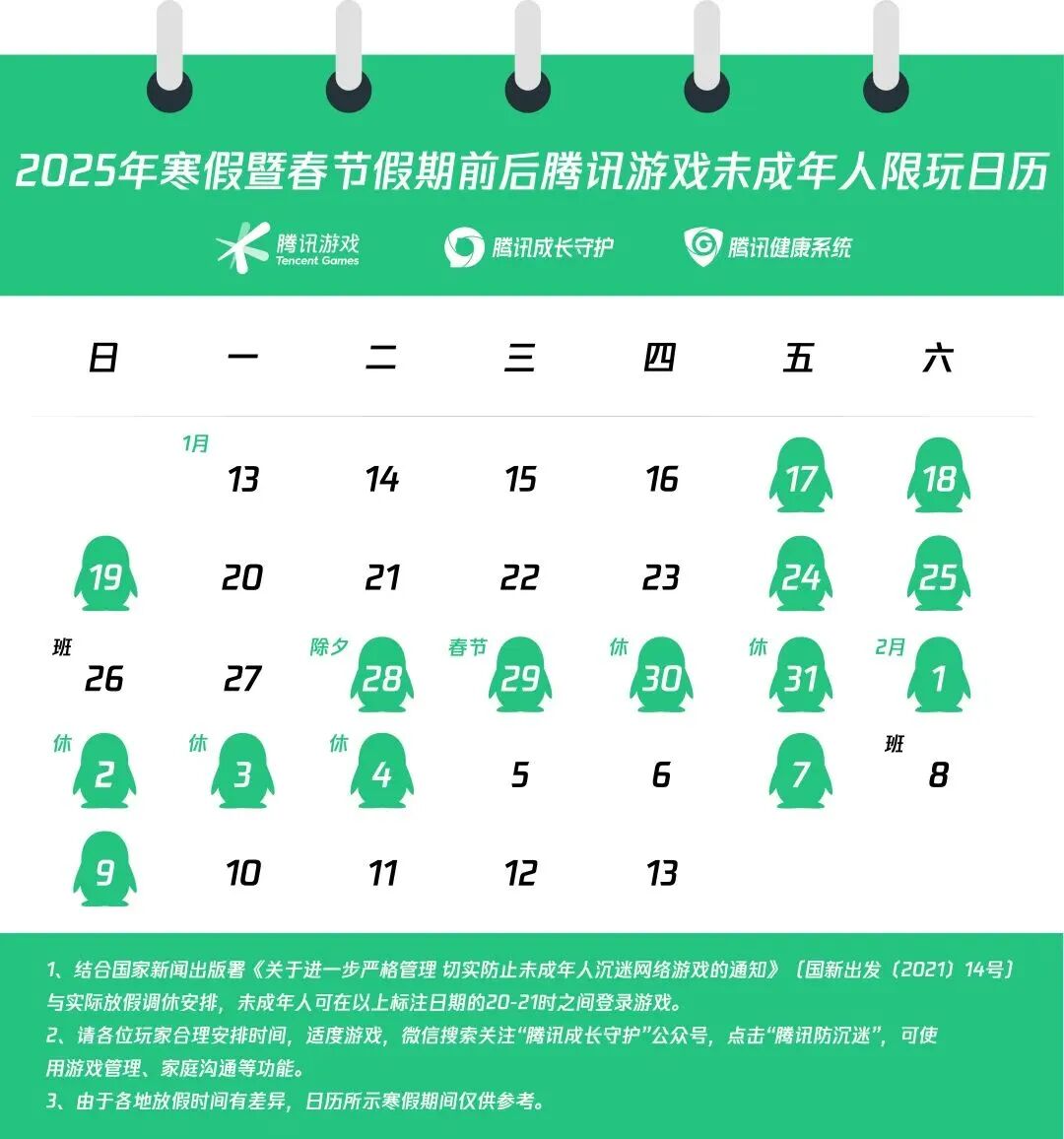 1月9日,网易游戏、腾讯游戏陆续发布2025年寒假未成年人游戏限玩日历表,未成年玩家在以下标红日期的20—21时可以登录体验游戏。