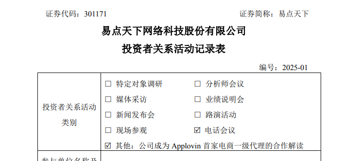 在本次电话会议的过程中,机构重点关注易点天下与全球最大独立移动广告平台之一AppLovin合作具体内容,以及与AppLovin的合作对该公司2025年收入和利润影响。1月7日,AppLovin在其公众号上正式宣布,与易点天下达成电商战略合作,易点天下是AppLovin首家电商一级代理。